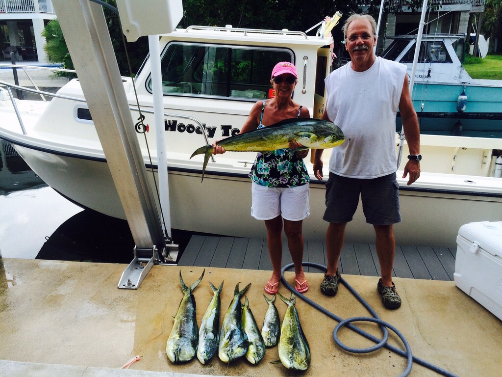 Saturday, we took the woodytoo offshore, seas were crazy sloppy, kind of all over the place, and the weeds were thick and scattered. So it made it difficult in cockpit but we managed through it. We started in close without any luck and worked our way out generally to the humps straight south of looe key. Very, very slow all morning. When we got to 650 ish and we found some better weed lines, a bunch of birds, and started picking up dolphin. In the middle of the flurry, we had a blue marlin smash a blue and white Hawaiian eye rigged with a horse ballyhoo on the short rigger but it did not come tight. We freespooled and he picked it up again and we had it for about 15 seconds peeling line and then gone again. Close!!! When we got back to the house my daughter decided to beat me with a fish … I guess she was mad at me for missing the blue one!