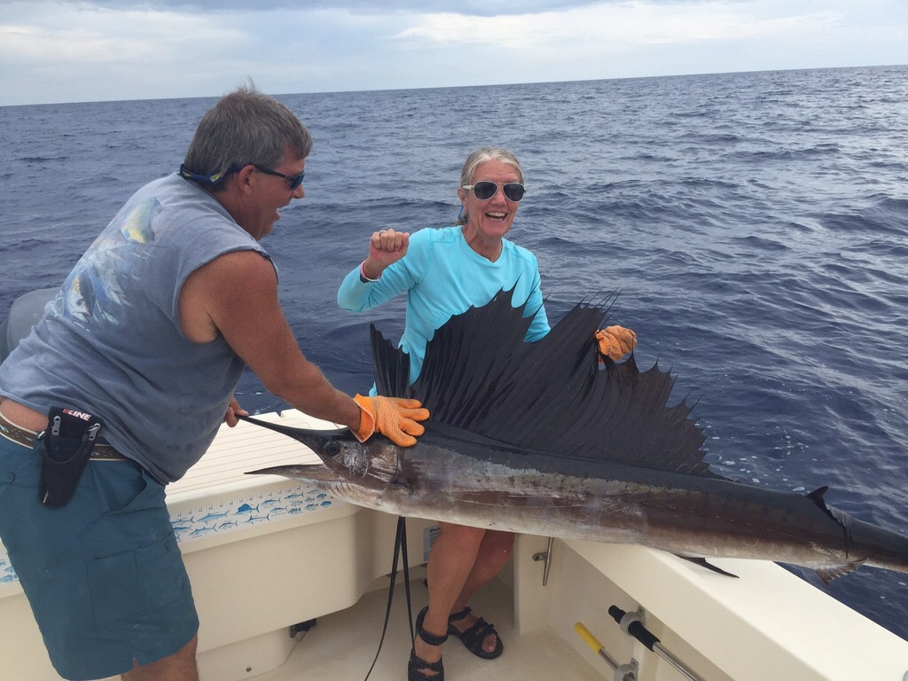 On Friday, we headed back out toward the wall for another shot at them. We put in at 900 feet under a trio of frigate birds, and right into the fish. Immediately we nailed a triple of gaffer dolphin, then were swamped with schoolies, and then hit another gaffer. The morning really was looking good when bam – we hooked and landed our first sail since we got our place down on BPK. The honors went to my wife Robin, who did a great job on the rod and reel, and was hooting and hollering the whole time! What fun!!!!