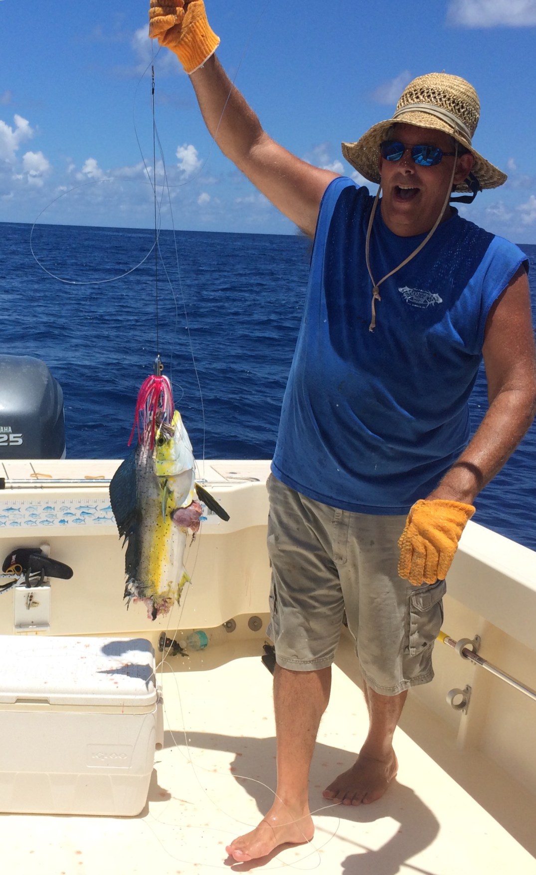 Sunday calm winds and seas made for a wonderful ride! We ran straight out to the 650 mark and again found scattered weeds and nothing really biting! Do these fish have keys disease? They don’t seem to want to bite until the afternoon! We ended up running out toward the wall, and found a couple awesome weedlines in 850 or so and started steadily picking up fish. There always seems to be a story with us – but I put my wahoo planer down and it got wacked hard by a decent dolphin. I have the drag cranked hard on that outfit so the fish waterski’d straight to the surface. As I wound it in toward the boat what looked like a mako wide head and shoulders came grayhounding up from behind it and smashed the fish. Don’t know for sure about if it was a mako or not, it was certainly big and acted like one. I run that rig on wire, too bad he missed the hook! End result: